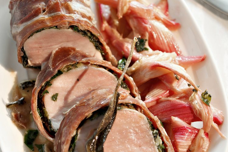 Ce plat a des influences italiennes, mais préparé avec une certaine originalité, combinant la sauge, le Parme et la rhubarbe.