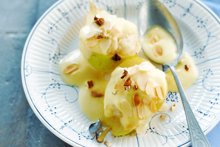 Égoutter les poires et les répartir dans des assiettes. Ajouter la crème, parsemer d’amandes grillées et servir sans attendre.