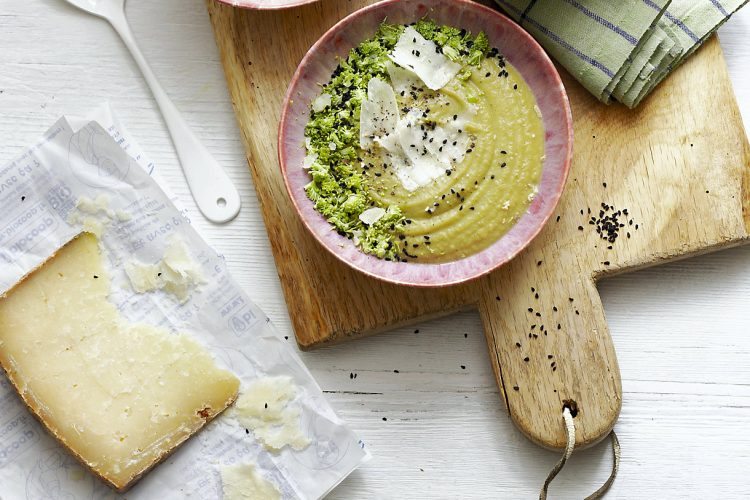 Servir la soupe avec le brocoli cru, ainsi que les copeaux de Tomme de brebis et parsemer de graines de nigelle. Terminer en assaisonnant.